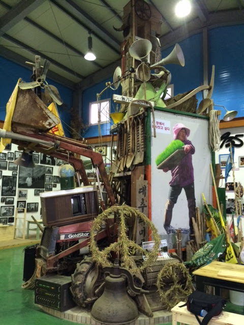 First thing this morning we were taken from the peace center, where we spent the night in second floor guest rooms, to a peace museum on the other side of the village. The photo above is a sculpture that sits in the center of the museum representing the former lives of the villagers and their intense multi-year non-violent struggle to save their way of life. In the end they were defeated but we were told that the Pyeongtaek struggle was a milestone in creating a new way of resistance in South Korea where art and non-violent struggle came together to inspire future movements like we have seen more recently on Jeju Island.