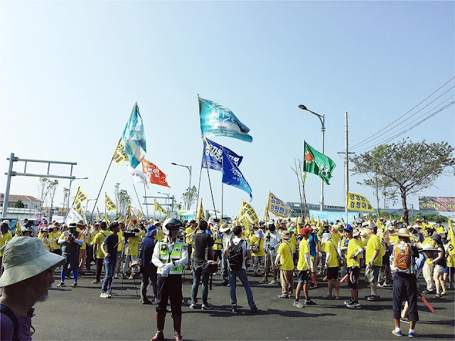 In my short talk last night I told the hundreds who were assembled at the final rally the story of our protest in Bath, Maine last June when 12 of us (Zumwalt 12) were arrested at the Bath Iron Works shipyard for blocking the road and gate into the 'christening' ceremony for a new warship. I said that warship was likely to visit Gangjeong village at some point. I told the people that they inspired us in Maine to act - in fact five of the 12 of us who were arrested have been to Gangjeong village over the past few years. I said we'd continue to support them into the future.