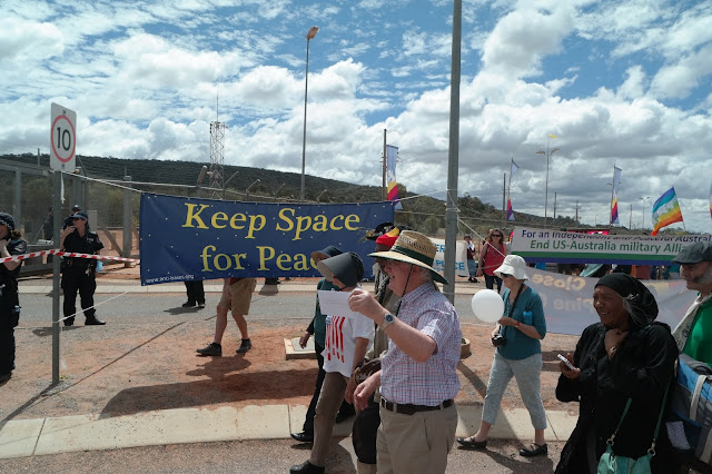 Protest at US NSA spy (and drone targeting) base called Pine Gap in the middle of Australia. The US intercepts all phone, fax, email communications across the entire Asia-Pacific region from this base.