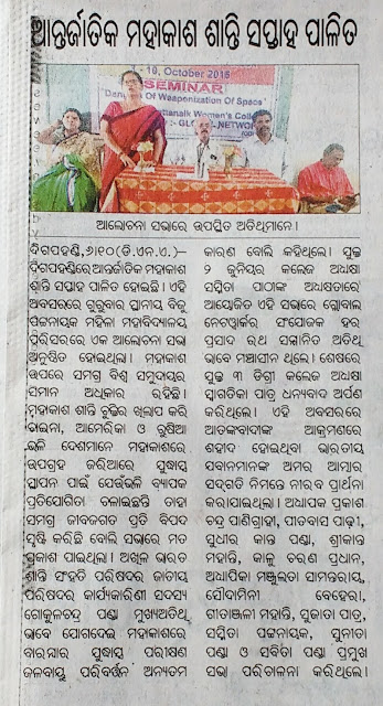 On October 6 a seminar on "Dangers of weaponization of space'' was held at Biju Pattanaik Government Women's College in Digapahandi, Orissa State.