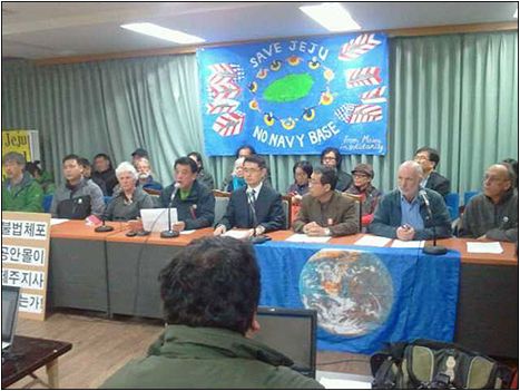 | GN members joined Gangjeong village leaders in 2012 on Jeju Island for a news conference to denounce the construction of the Navy base in their village. |