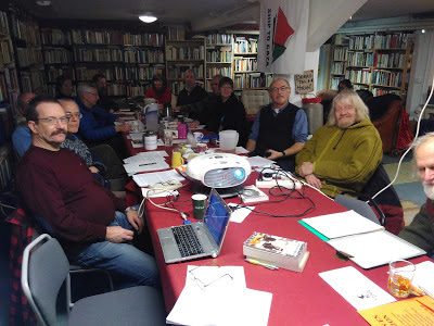 When I was recently in Gothenburg, Sweden, Dave Webb (UK) and I were taken by our friend Andre Brochu to a local radical bookstore in a cozy basement. The warm and snug feeling inside this cave-like book warren helped to make it a special night. Andre is originally from the northeast in the US but moved to Sweden during the Vietnam war as part of his draft resistance. He stayed there, raised a family, and worked as a librarian. He is often sending emails to me with many excellent resources.