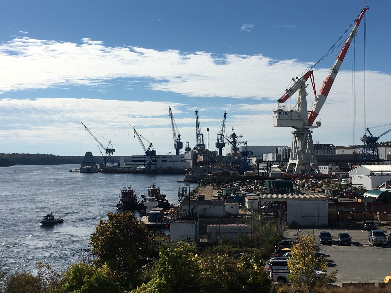 Bath Iron Works (BIW) from a nearby bridge. On lower left see the security boat watching us.