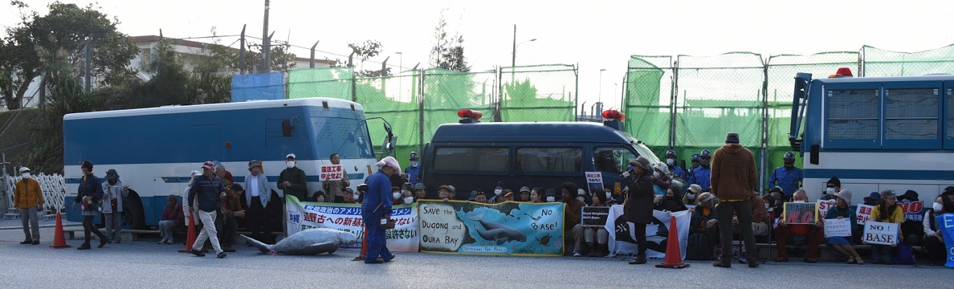 We arrived early this morning at the gates of Camp Schwab at Henoko. We held the great banner made by fellow Mainer Russel Wray (Hancock) as GI’s and Okinawan civilian employees began arriving for work. The line of cars was long so entering the base was slow going which made it possible for the car drivers to get a good look at the banner.