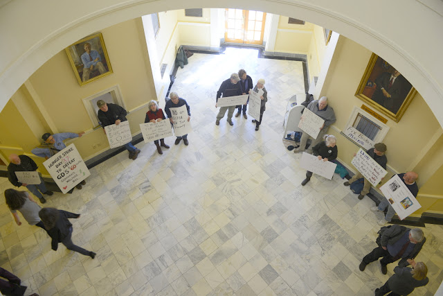 | Vietnam veteran Tom Ryan (still fasting) and Cynthia Howard among the 12 of us in the hallway of the state capital today - we will return Tuesday, Wednesday and Thursday next week. |