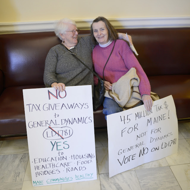 One of our advisers today shared with us that the Democrats in the legislature are quite vulnerable now as they attack Gov. LePage for his decision to insert a bill that would conform (or match) Maine with Trump's federal tax bill that recently passed in Washington. (Of course the Dems should oppose LePage's effort to copy Trump's give-a-way to the rich and corporations.) But for the Dems in Maine to oppose LePage's 'conformity' tax bill and then turn around and support giving $45 million to General Dynamics is the height of hypocrisy. So the Dems in Augusta have put themselves in a real moral, ethical and political bind.