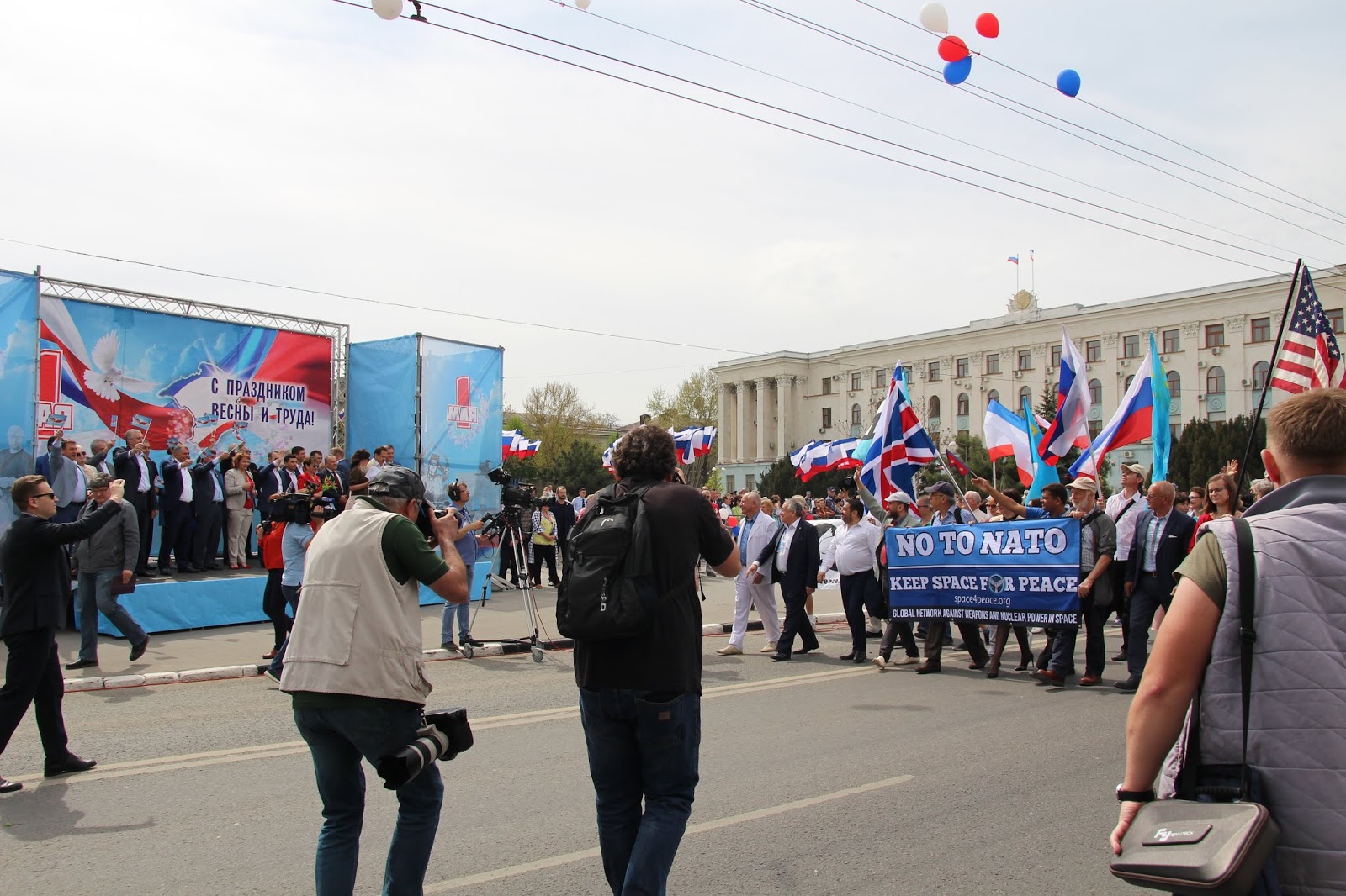We began the day participating in the May Day parade in Simferopol, Crimea. Our banner was a huge hit with many people wanting to get behind it before the parade began.
